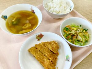 配膳している最中、子どもたちが「お腹がすきすぎてがまんできへん!」と言っていました。目の前のとんかつがとても美味しそうに見えていました。