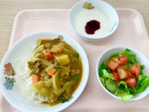 10月14日(火)、今日のメニューは、カレーライス、生野菜サラダ、ヨーグルト(ブルーベリーソース)でした。