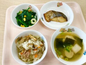 10月15日(水)、今日のメニューは、きのこご飯、さわらの照り焼き、竹輪とほうれん草のソテー、味噌汁でした。