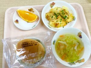 10月16日(木)、今日のメニューは、ロールパン、ツナとじゃが芋のチーズ焼き、コンソメスープ、オレンジでした。