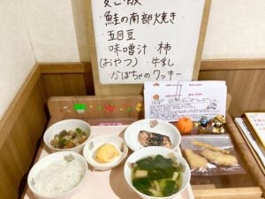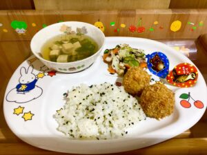 和食メニューがそろっており、たまにはこんな日があります。小松菜は子どもからすると、苦手な食材の一つです。和え物には柔らかめに茹でる工夫をしたり、一緒に入れる食材も、うま味のあるちくわを入れてみたりしました。