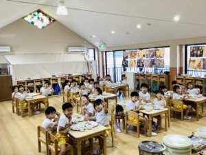 いただきます、の前に子どもたちに少しお話をしました。「きょうはいちねんでいちばんおつきさまがきれいな日です。たべものやしぜんにありがとうというきもちをもって、おつきさまにだんごをおそなえします。おうちでもよるにおつきさまをみてくださいね」