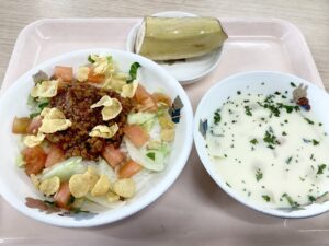 タコライスには、レタス、トマト、ひき肉ミート、仕上げにコーンフレークを散りばめ、見た目にも食欲そそるメニューです。シチューみたい!と言っていた豆乳で出来たスープも人気でした。