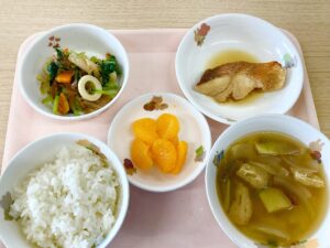 10月21日(火)、今日のメニューは、赤魚の煮つけ、小松菜と竹輪のお浸し、さつま汁、みかん缶でした。
