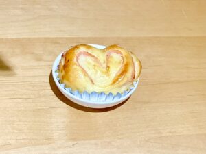 毎月1回、生地から手作りのパンを作っています。今回はハムを入れ、アルミカップに乗せハート型の切り口にしました。「ふわふわでおいしい~!」と好評でした。