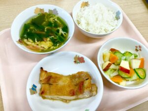 10月22日(水)、今日のメニューは、鶏のマーマレード焼き、りんごサラダ、かき玉汁でした。