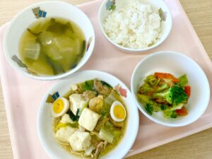 豆腐の中華煮には干し椎茸をいつも入れています。干し椎茸は良い味が出て体にも良いのでが、どうしても苦戦してしまいます。いつもこのメニューには入れているので子どもたちも分かってきたのか、「全部たべれた~きのこも食べたよ~」と言ってくれる子もいました。