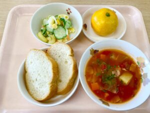 10月27日(月)、今日のメニューは、フランスパン、ミネストローネ、マカロニサラダ、みかんでした。