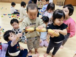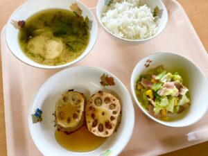 前日に、節でつながった長いれんこんを子どもたちに見せました。ほとんどの子が何か分からなかったようです。切り口を見せて「あなぁのあいた・・・」と歌ってみると「れんこん!!」と答えていました。