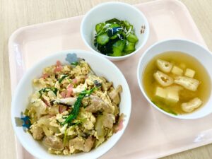 10月29日(水)、今日のメニューは、親子丼、胡瓜とワカメの酢の物、味噌汁でした。