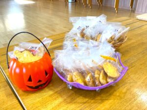 「トリックオアトリート!」と元気な声で言った子どもに、一人ずつ魔女がおやつを配りました。おばけ、こうもり、かぼちゃ、ねこ・・・などいろいろな形のクッキーで、子どもたちは大喜びでした。