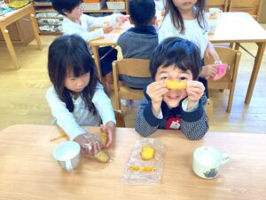 コロッケに使用したサツマイモは園庭で採れた分も使っています!みんなで水やりして大きくなりました。