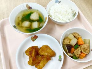 今日のメニューは、わかめご飯、サツマイモのコロッケ、ビーンズサラダ、すまし汁、プチゼリーでした。