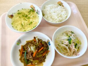 10月9日(木)、今日のメニューは、肉野菜炒め、春雨の酢の物、中華風コーンスープでした。