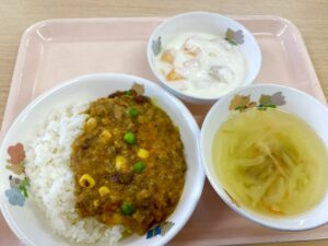 園のドライカレーには、ミンチや玉葱、人参以外に、大豆、コーン、グリンピース、レーズンが入っています。ちょっぴり豆類が苦手な子もいましたが頑張って食べていました。