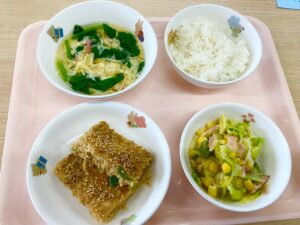 12月2日(火)、今日のメニューは、豆腐入り松風焼き、キャベツとベーコンのソテー、かき玉汁でした。