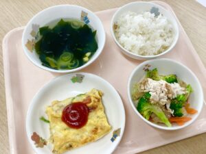 オムレツにはピーマンが入っています。ピーマンが苦手、、、な子どもがいるのですが、苦手だけどがんばった~と言ってくれました。