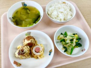 12月4日(木)、今日のメニューは、竹輪とウィンナーの天ぷら、白菜とほうれん草のポン酢和え、味噌汁でした。