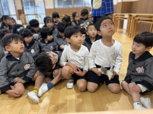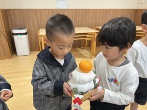 最後は、作った鏡餅を運ぶレースをしました。グラグラゆれる鏡餅をとなりの人に渡していきます。2グループに分かれて二回勝負しましたが、どちらのグループも一回ずつ勝ちました。