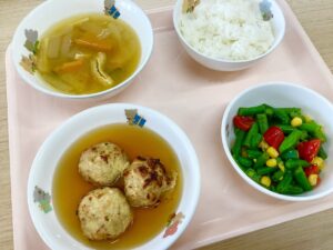 2月3日(火)、今日のメニューは、鶏のつくね焼き、いんげんのソテー、味噌汁でした。