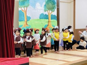 2歳児クラスは『おおきなかぶ』の劇を行いました。いろんな動物や人物になりきって、大きな大きなかぶが抜けましたね。その後は、『山の音楽家』の歌を合唱しました。動物たちがフルートや太鼓、バイオリンなどを演奏しながら歌う様子が可愛かったです。