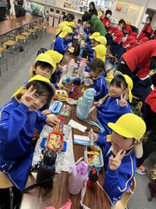 昼食は保護者の方が作ってくれたとても美味しそうなお弁当です♪みんなと一緒に食べるお弁当は美味しいね!